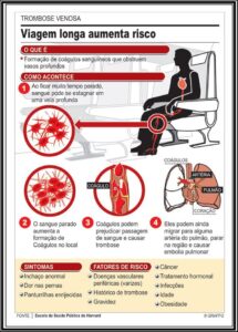 Coágulos nos vasos sanguíneos das pernas podem ser formados durante uma viagem aérea acima de quatro horas de duração. A imobilidade por longos períodos de tempo, sentado em espaços apertados favorece a ocorrência da chamada estase da circulação.  O termo clínico para este tipo de coágulo de sangue é trombose venosa profunda (TVP). Quanto mais tempo o voo, o maior risco para desenvolver um coágulo. Voos com duração de 8 -10 horas ou mais representam o maior risco.